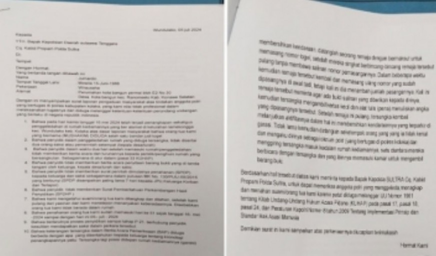 ''Berdasarkan hal tersebut diatas kami meminta kepada Bapak Kapolda SULTRA Cq. Kabid propam Polda Sultra, untuk dapat memeriksa anggota polri yang menggeleda,menagkap dan menahan suami/orang tua kami karena patut diduga melanggar UU Nomor 1981 tentang Kitab Undang-Undang Hukum Acara Pidana (KUHAP) pada pasal 17, pasal 18, pasal 24, dan Peraturan Kapolri Nomor 8 tahun 2009 Tentang Implementasi Prinsip dan Standar Hak Asasi Manusia,'' pungkasnya.