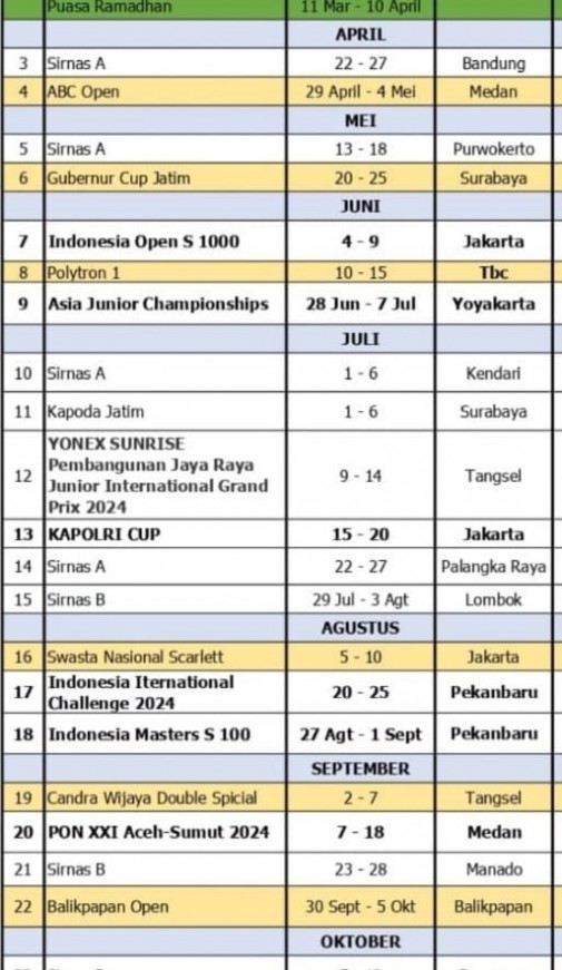 Berdasarkan kalender PBSI 2024 turnamen Sirnas A U17, U-19, dewasa di Kendari, Sultra akan terselenggara tanggal 1-6 Juli 2024.
