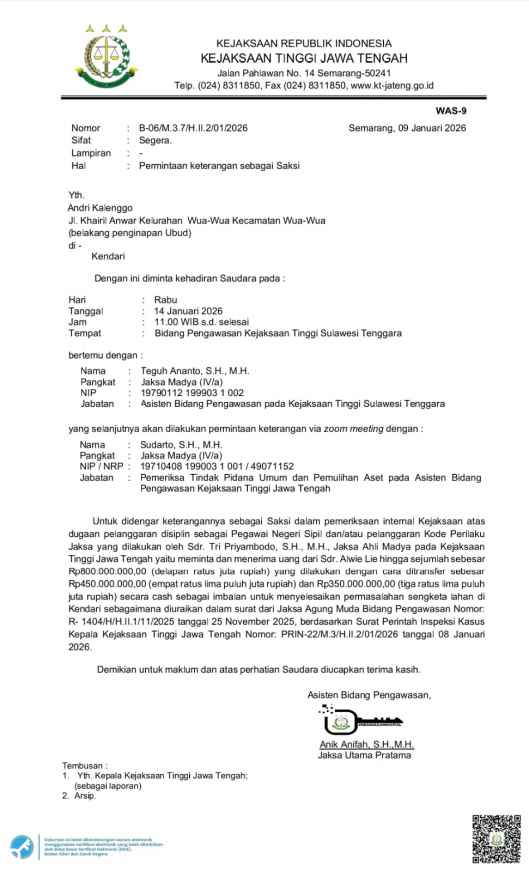Kejati Jateng sendiri sudah mengeluarkan surat perintah inspeksi No: PRIN-22/M.3/H.II.2/01/2026.