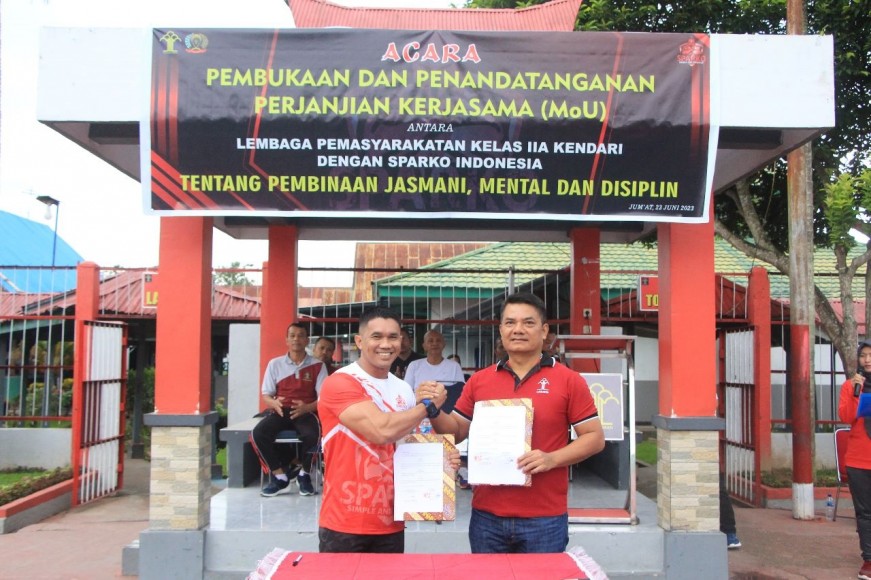 Bertindak atas nama Sparko Indonesia, Herfain selaku Ketua Umum Sparko Indonesia yang menandatangani perjanjian kerja sama dengan Lapas Kendari turut menyematkan Pin dan menyerahkan plakat Tanda Warga Kehormatan Sparko Indonesia kepada Kepala Lapas Kelas IIA Kendari, Tapianus Antonio Barus.