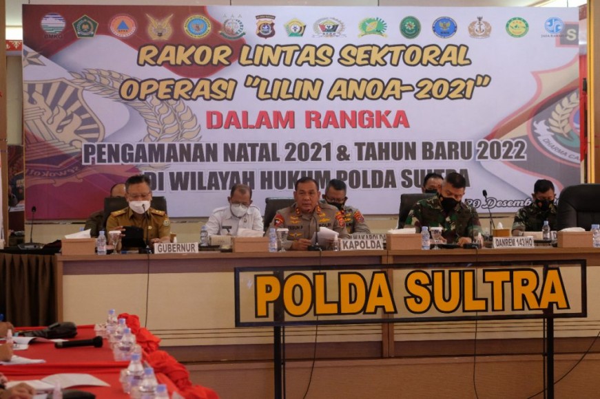 Kendari | sapasultra.com - Kepolisian Daerah Sulawesi Tenggara (Polda Sultra) menggelar Rapat Koordinasi Lintas Sektoral Operasi Lilin Anoa 2021 dalam rangka pengamanan Natal 2021 dan Tahun Baru 2022 di wilayah hukum Polda Sultra, Senin (20/12/2021).