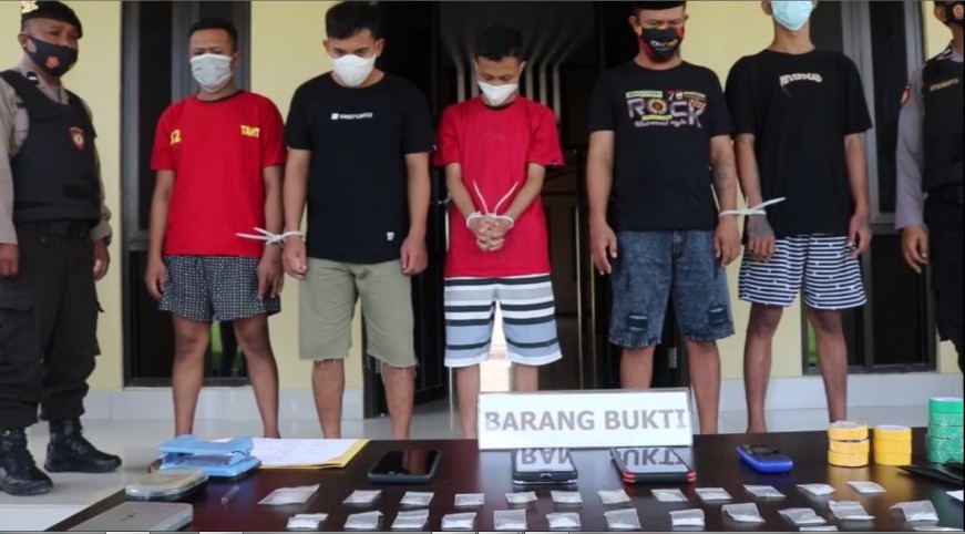 Kelima pelaku masing-masing MS (21), MR (31), AAP (18), MAP (23), dan AES (31). Total barang bukti yang disita polisi, tembakau gorila seberat 0,6 gram dan sabu seberat 31,53 gram.