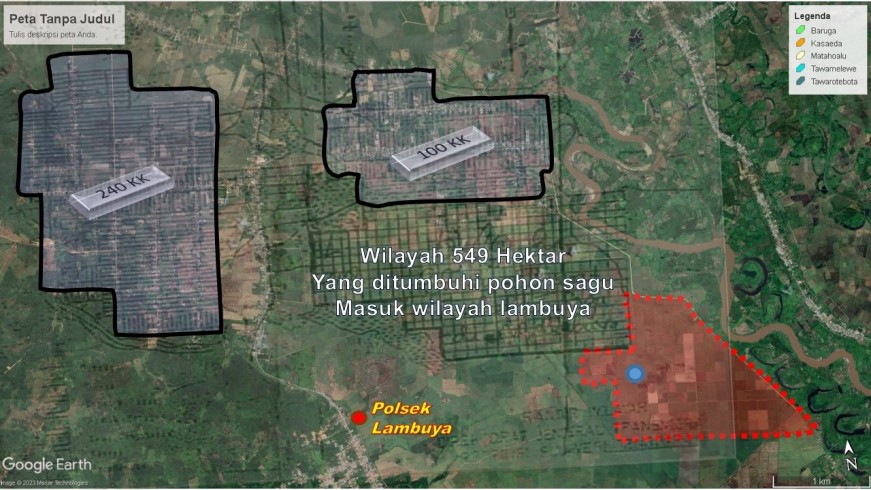 Jika melihat data, jelas sekali kalau lahan diklaim tidak masuk dalam wilayah transmigrasi. Masyarakat transmigran di Desa Tawamelewe didatangkan Pemerintah Pusat sejak tahun 1974. Saat itu, Uepai merupakan wilayah administratif Kecamatan Lambuya, sebelum akhirnya dimekarkan tahun 2003. Lahan transmigrasi yang disiapkan pemerintah saat itu mencapai 500 hektare. Namun kenyataannya, saat ini warga transmigran sudah memiliki lahan sekira 800 hektare.