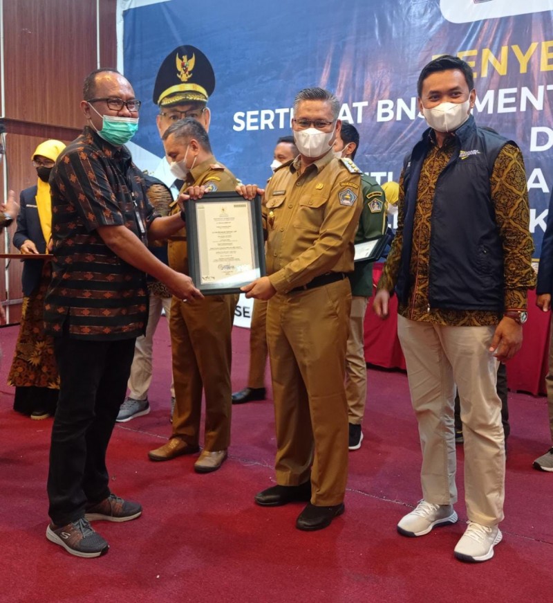 Kendari - Wali Kota Kendari menyerahkan sertifikat dari Badan Nasional Sertifikasi Profesi (BNSP) pada mentor yang lulus sertifikasi dan menyerahkan rebranding pada pelaku Usaha Mikro Kecil (UKM) yang digelar Kendari Preneur di salah satu hotel di Kendari, Selasa (21/12/2021).