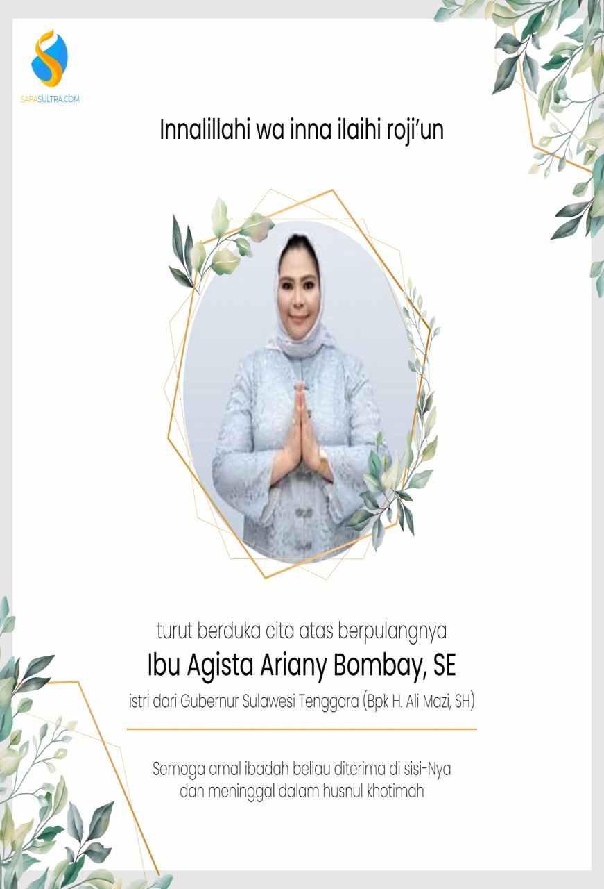 KENDARI - Innalilahi Wa Innalilahi Rajiun, berita duka datang dari salah satu istri Gubernur Sulawesi Tenggara (Sultra) H. Ali Mazi, yakni Agista Ariany Bombay, SE, pada Selasa, (13/07/2021), sekira Pukul 17.30 Wita.