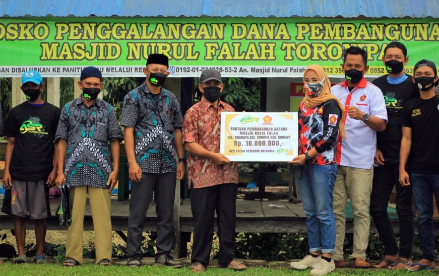 Konawe | sapasultra.com - Dewan Pimpinan Daerah (DPD) Partai Gerakan Indonesia Raya (Gerindra) Sulawesi Tenggara (Sultra) bersama dengan ASR Sultra, memberikan bantuan dana untuk pembangunan Masjid Nurul Falah Kelurahan Toronipa Kecamatan Soropia Kabupaten Konawe sebesar Rp 10 juta.