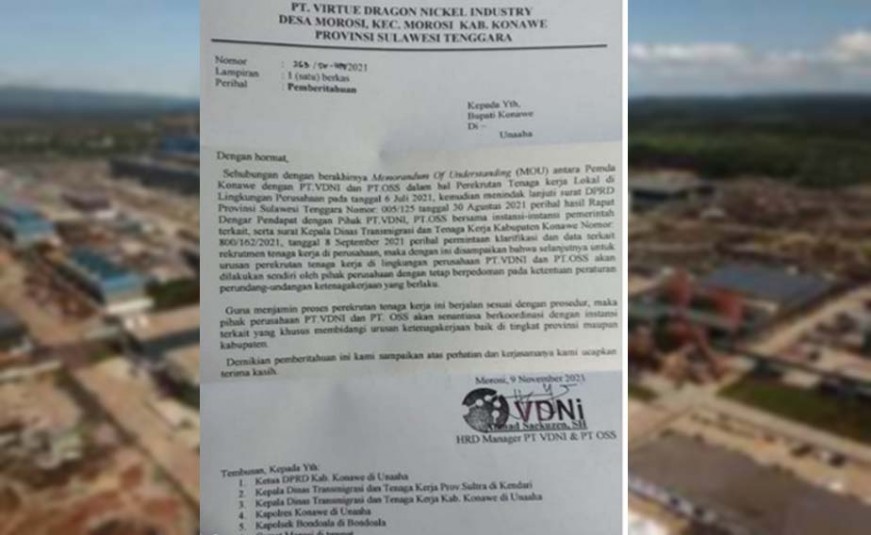 Serta surat Kepala Dinas Transmigrasi dan Tenaga Kerja Kabupaten Konawe Nomor 800/162/2021, tanggal 8 September 2021, perihal permintaan klarifikasi dan data terkait rekrutmen tenaga kerja di perusahaan.