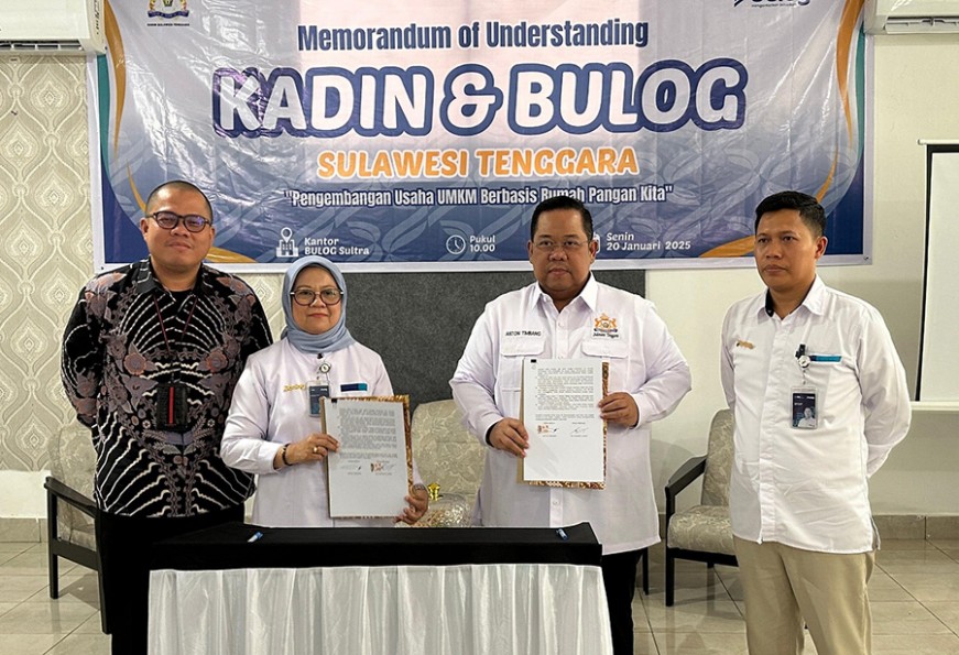 KENDARI, SAPASULTRA.COM - Ketua Kadin Sulawesi Tenggara (Sultra), Anton Timbang, dan Kepala Bulog Sultra, Sitti Mardati Saing, menandatangani nota kesepahaman (MoU) untuk pengembangan usaha mikro, kecil, dan menengah (UMKM) berbasis Rumah Pangan Kita (RPK) di Kantor Bulog Sultra, Senin (20/01/2025).