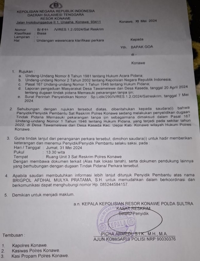 KENDARI,SAPASULTRA.COM - Sehari pasca BPN Konawe turun melakukan pengukuran di Desa Tawamelewe dan Kasaeda, surat panggilan dari Polres Konawe yang ditujukan kepada Habibi dan ayahnya bernama Goa tiba pemukiman yang mereka tempati.
